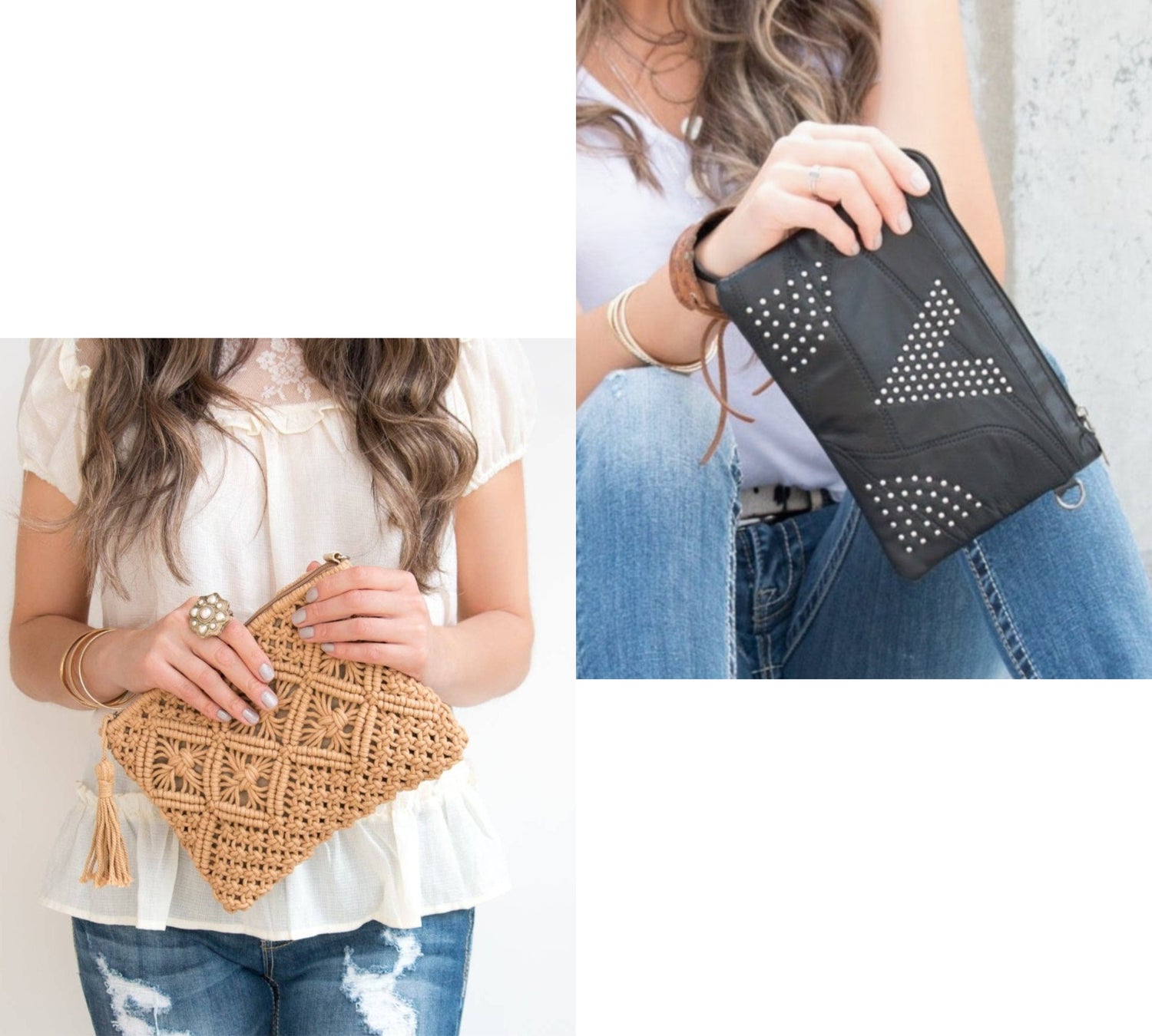 Embrace your free spirit with woven bags, boho clutches, intricately designed jewelry such as beaded necklaces, stacked bracelets, and feathered earrings to complete your look.