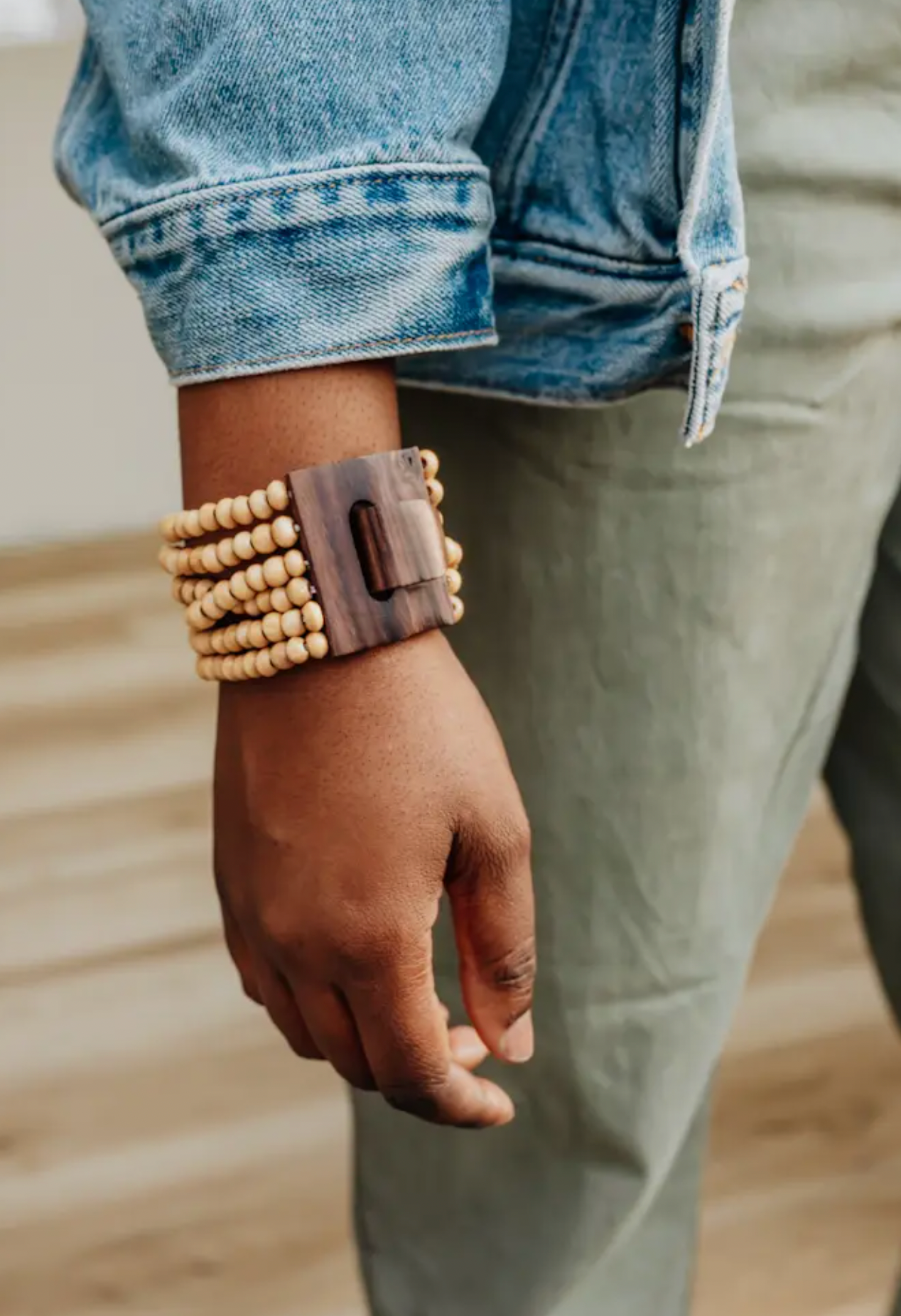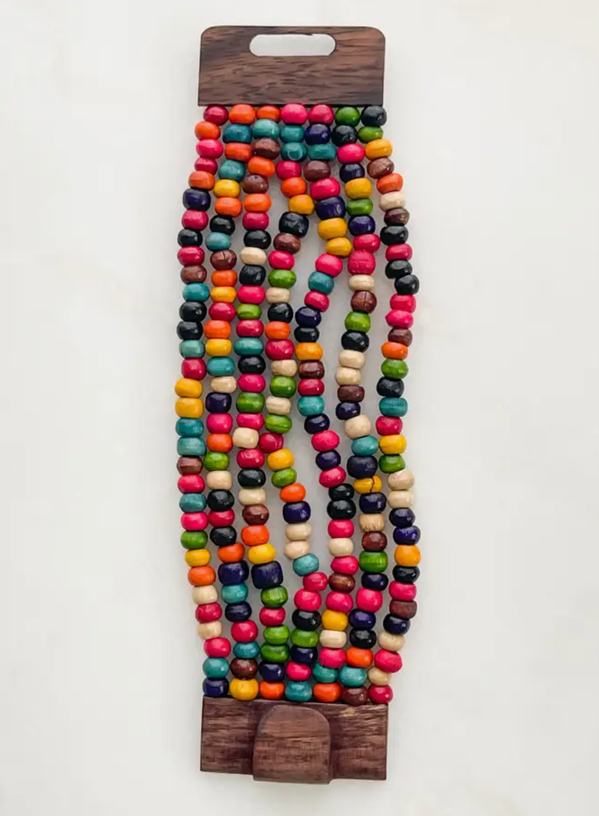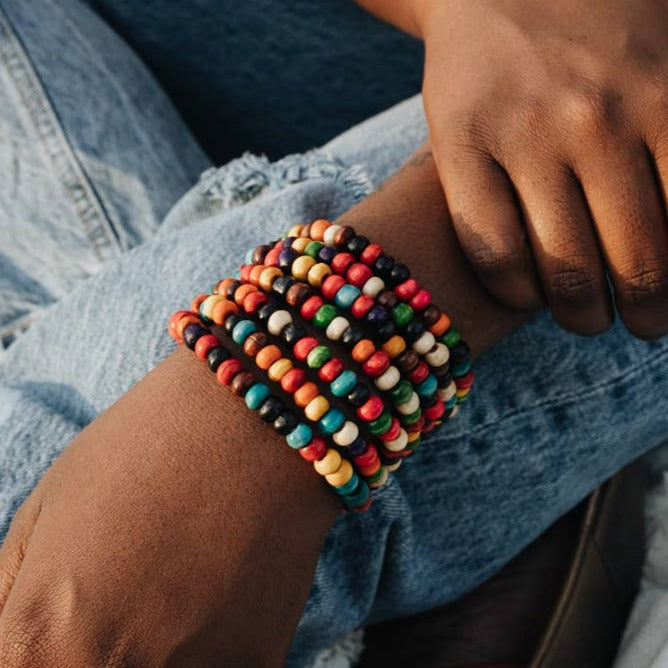 -Ethically made in Indonesia -Multi-colored (5 mm) wooden beads strung on elastic -2" wide wooden clasp -Fits up to a 7.5" wrist -Wooden beads and clasps are crafted by local artisans Crowned Free is on a mission to end human trafficking through ethical fashion and gifts featuring boho-inspired women's clothing, survivor-made candles and jewelry, home decor, and accessories. We give back by creating safe and sustainable jobs for survivors who make many of our products. We also financially support anti-trafficking organizations here in the USA and around the world!