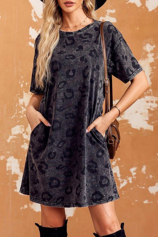 Vintage Washed Leopard T-Shirt Dress with Pockets